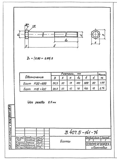 Болт М 16х400 выпускается в соответствии с типовым проектом 3.407.5 (3.407.5-141-74).